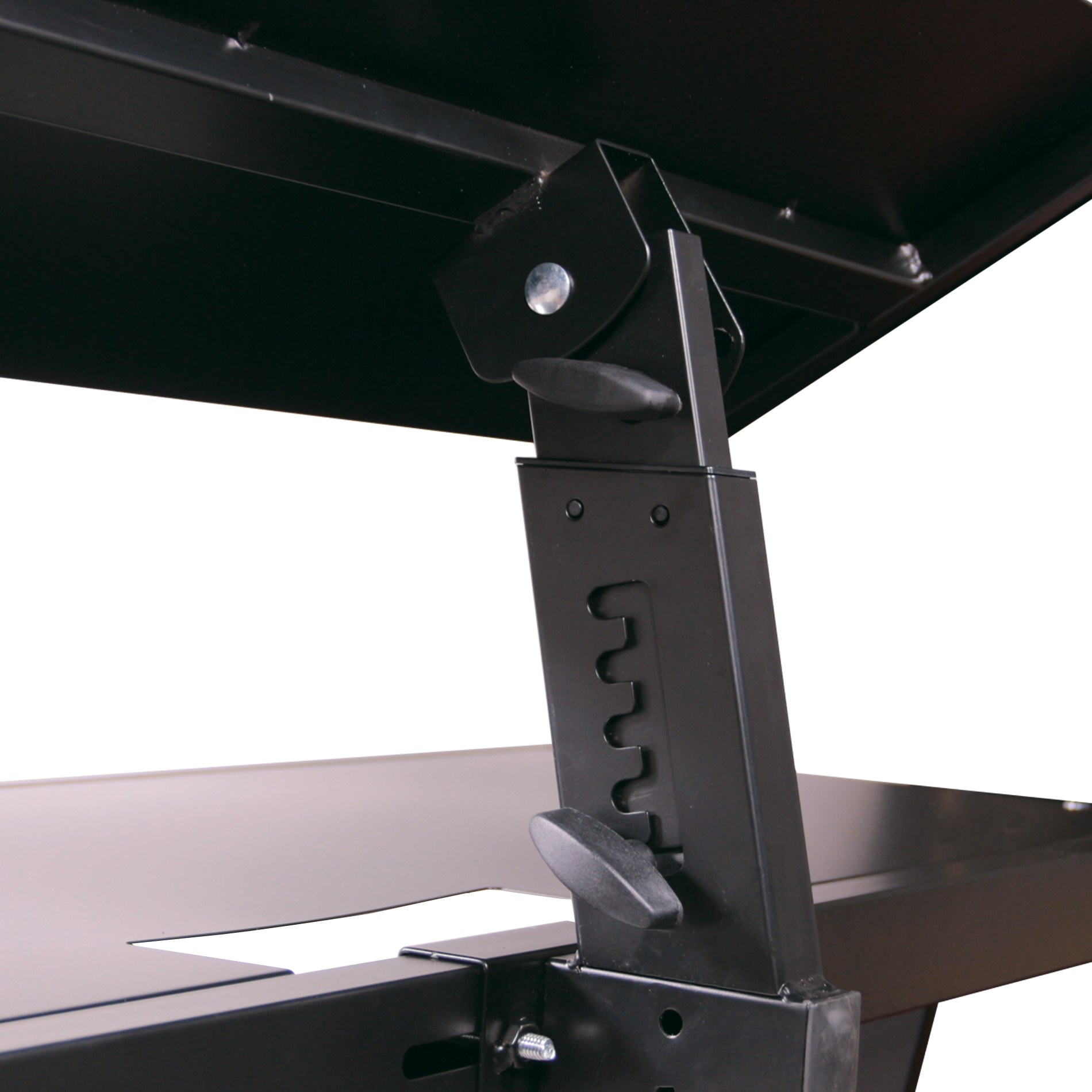 La DJ TABLE 130 est un support mobile pour DJ, il sera un outil indispensable pour vos soirées. Il sera très facile à monter et vous permettra une installation rapide de votre matériel Dj. Cette table s’adapte à tous vos besoins, vous pouvez régler la hauteur jusqu’à 90 cm, le support pur ordinateurs portables ou contrôleurs est inclinable et réglable en hauteur. La table est fabriquée en acier et dispose d’une finition noir satinée.