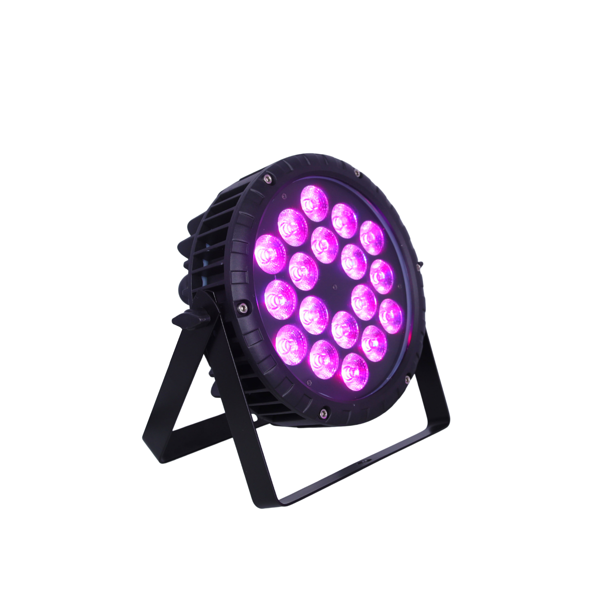 Projecteur IP65 de type Wash comprenant 18 LEDs de 12W 5-en-1 (RGBW+A). Coque en aluminium moulée robuste. Nouvelle technologie de gradation électronique (PWM) éliminant les scintillements. Utilisation en mode DMX, musical ou automatique.