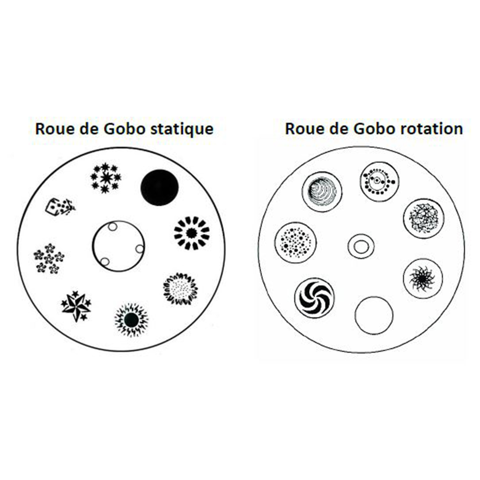 - 2 Roues gobos (7 Gobos statiques + Blanc et 6 Gobos rotatifs dont 1 en verre + Blanc)