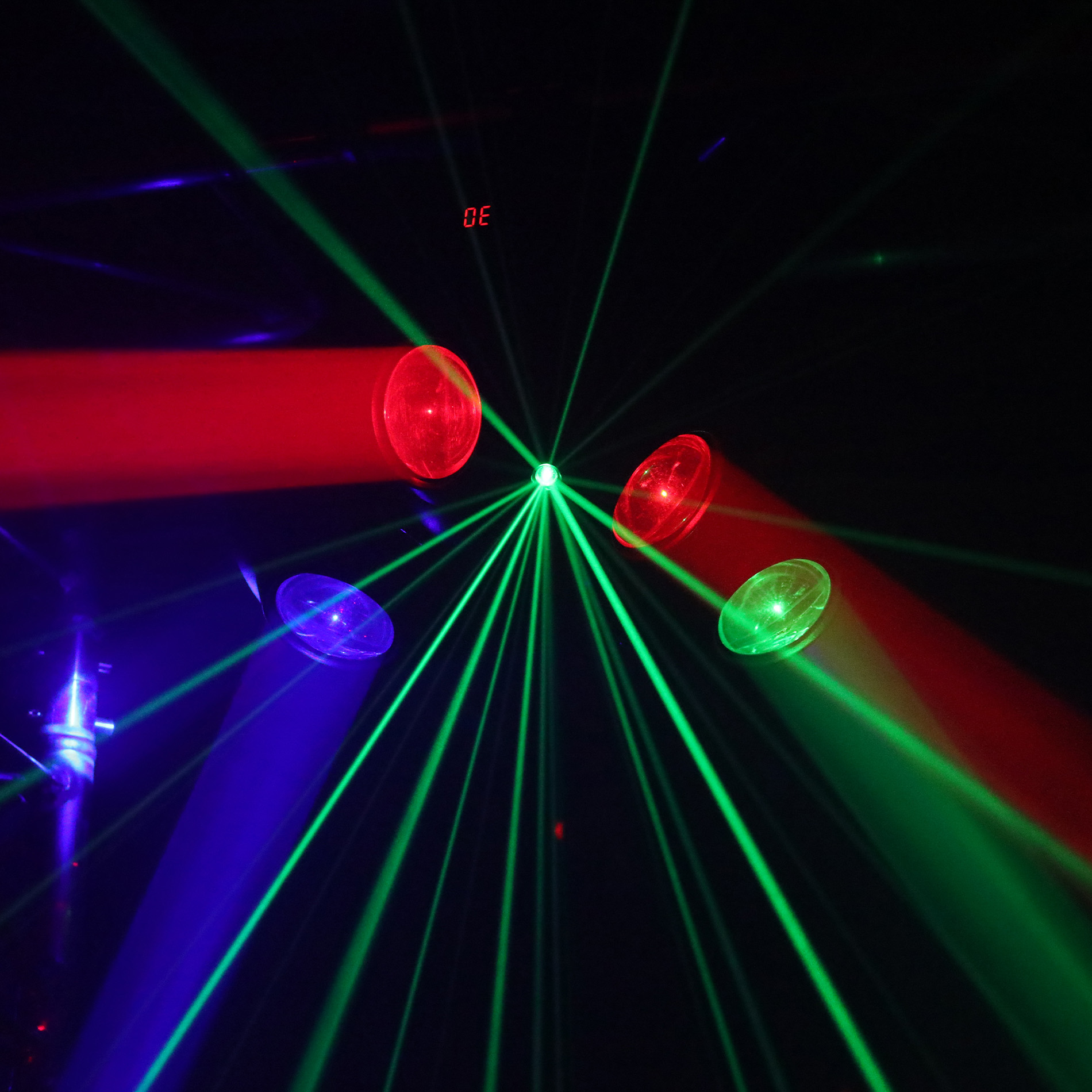 - Effet 3 Lasers : 1x100mW Rouge + 1x50mW Vert + 1x80mW Bleu